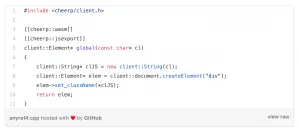 As an experimental prototype of anyref support, we decided to only allow classes defined in the special client namespace to be used in WebAssembly functions: these classes have no layout on the C++ side, only methods. Special methods starting with set_ and get_ are compiled to accesses to the corresponding member fields of the object. Classes declared in this namespace can model existing objects coming from the JavaScript outside of Cheerp, like the native web APIs or a third party JavaScript library.